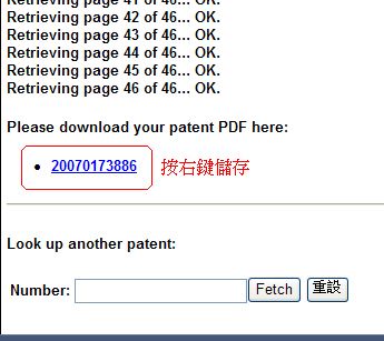 我隨便找一個Published application,然後貼在enter number的text box中,按Fetch Patent即可下載。