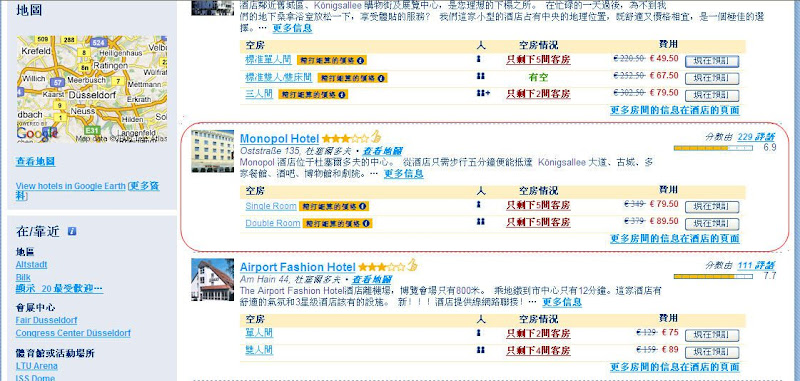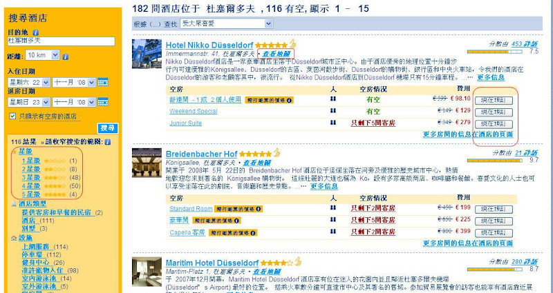 3 . 接著會顯示出杜塞爾道夫的旅館,在左邊有縮窄搜索範圍的功能的欄邊,我是以幾星級來選的,這樣直接可以挑到想要的價錢的旅館。